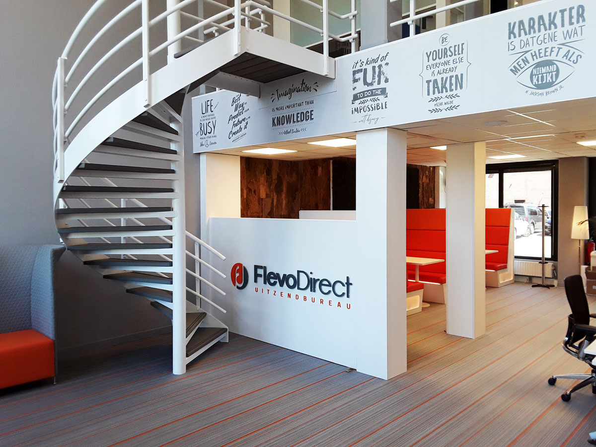 Het nieuwe pand van FlevoDirect uitzendbureau Lelystad is officieel geopend. Het uitzendbureau is van top tot teen voorzien van sfeervolle indoor en outdoor signing. Aan de buitenzijde zijn verlichte aluminium doosletters en een opvallende lightbox geplaatst. Hierdoor valt FlevoDirect óók 's avonds op. Op de glaspuien is een strakke raambelettering aangebracht en de vrijstaande vlaggen zorgen voor extra herkenbaarheid. Ook de binnenzijde heeft een bijzondere sfeer gekregen. De bedrijfsnaam is met dunne freesletters tegen de wand geplaatst. Daarnaast is in de wachtkamer een indrukwekkend en gedetailleerde inframe opgehangen. Bekijk hieronder het resultaat van dit mooie project.
